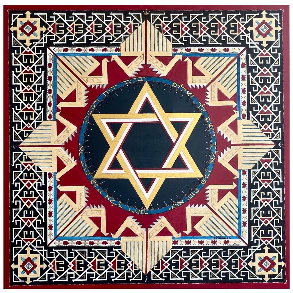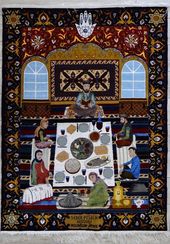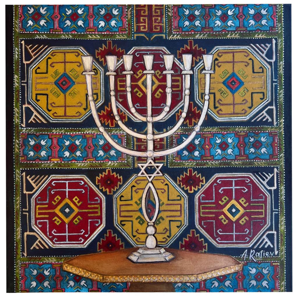 Ковры ручной работы, созданные по эскизам картин нашего героя – не просто предмет интерьера, а национальные произведения искусства, ценнейшая часть горско-еврейской культуры, когда орнаментальные узоры Азербайджана соединяются с духовными кодами горских евреев. Каждая деталь ковра символизирует важные события, праздники и обычаи горских евреев, будь то Пурим, Йом-Киппур, Песах, Рош ха-Шана. Каждый элемент ковра – символ, каждый ритм – память предков. Орнаменты и узоры ковров выполнены с особым уважением к традиционным формам, позволяя зрителю с огромным интересом погружаться в историческое прошлое горских евреев – выходцев из Азербайджана. Этническая принадлежность автора нaглядно передана в ковровых узорах, в сюжетах рисунков, в цветовой гамме его осязаемых творений, в формах и декоративных элементах, подчёркивающих специфику обычaев и трaдиций местных евреев.