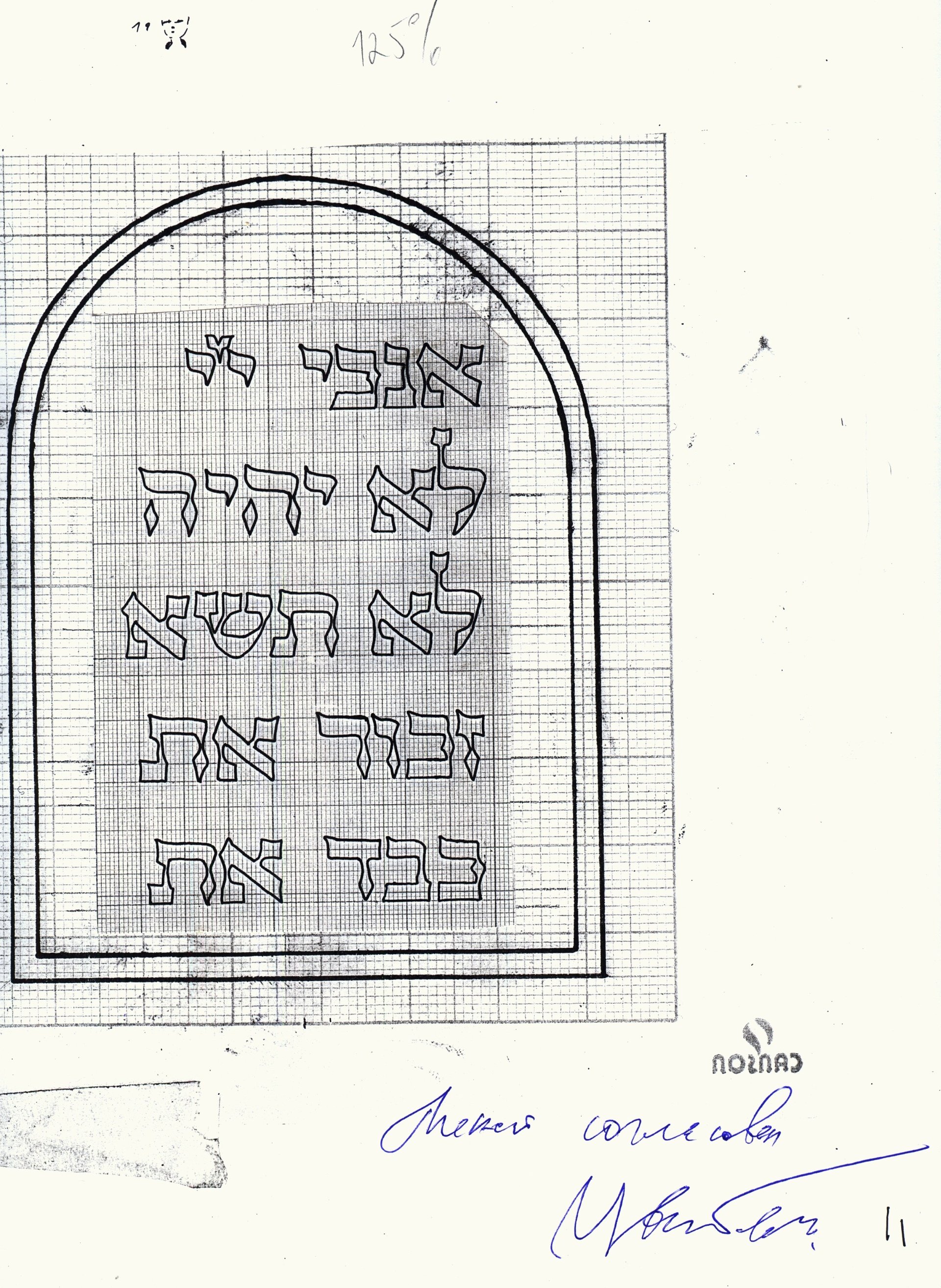 Однажды, перебирая бумаги синагоги, эскизы оборудования синагоги: Арон Кодеша, бимы, книжных и навесных шкафов – всё это изготавливалось в Петрозаводске, я с удивлением обратил внимание на один из них. Это эскиз Скрижалей Завета для дверей Арон Кодеша. Дело в том, что все эскизы, перед сдачей в производство должны быть подписаны заказчиком, чтобы исключить в дальнейшем недоразумения в случае неточного выполнения. И вот на эскизе Скрижалей Завета, на которых вырезаны Десять Заповедей, написанных Вс-вышним, да будет Имя Его благословенно, и врученных Моисею на горе Синай, тех Заповедей, которые стали этической основой современной западной цивилизации, которые звучат во всех уголках мира на всех возможных языках, внизу под ними размашисто написано: