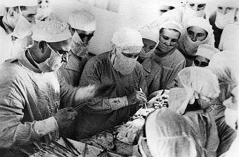 ![]() Профессор Абрам Михельсон ![]() Во время операции. На переднем плане - профессор А.Михельсон. |
