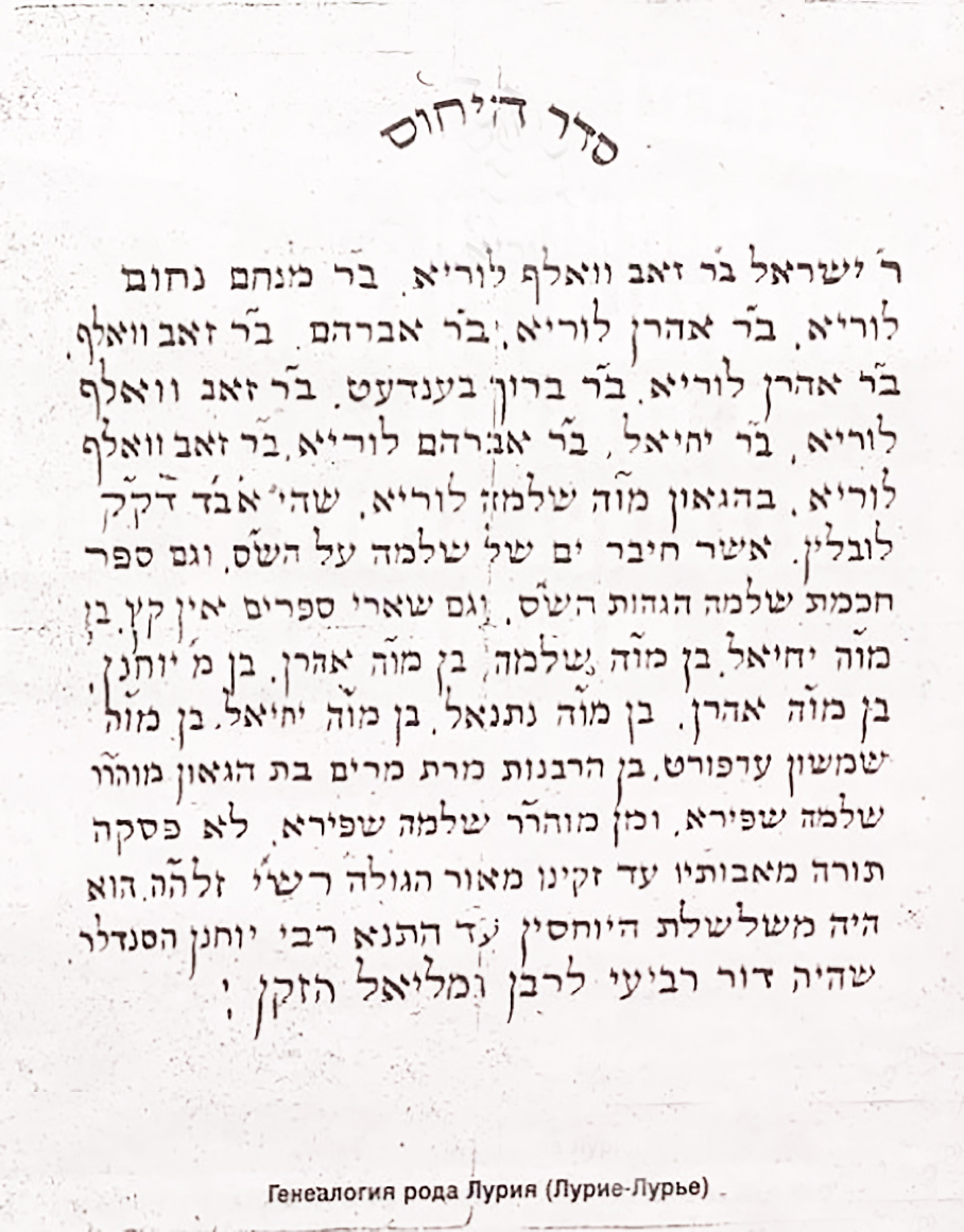 Евгения Кролик – правнучка Эль-Хана-на-бен-Израиля Лурье, подтвердила мне 21 ноября 1997 г., что бен ha-гаон морзну ha-рав Шломо Лурия был Ав-Бэйт-Дин де Карта Кадиша Люблин – главный судья святого города Люблина, он собрал (составил) книгу "Яд шель Шломо" – ha-Шас (“Море Соломона" – комментарии к Талмуду), а также книгу "Хохмат Шломо" – ha-гарот ha-Шас ("Мудрость Соломона" – комментарии к Талмуду), а также другие книги, которым нет числа.