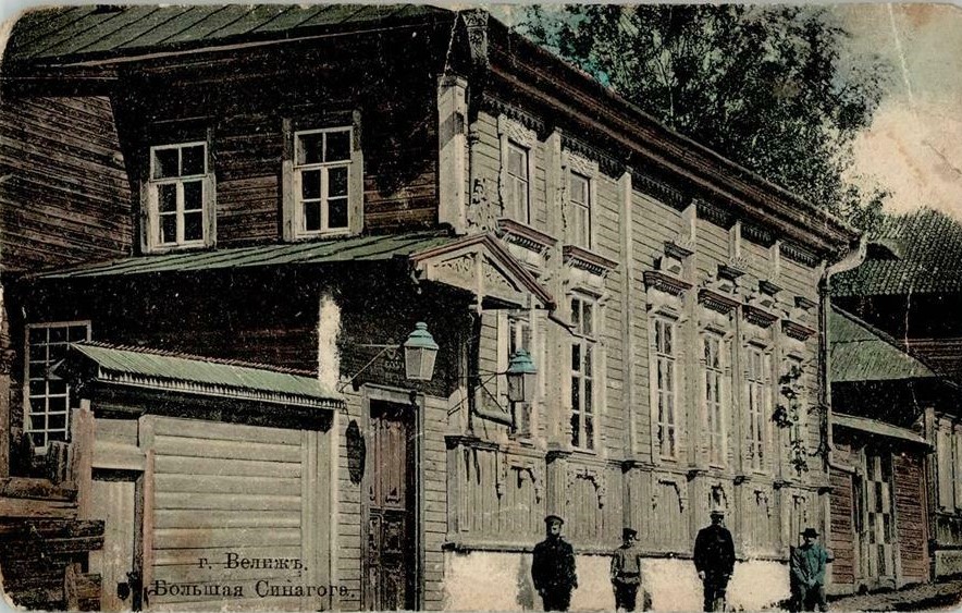 Еврейские молитвенные дома в Велиже находились, в основном, в обычных деревянных одноэтажных домах – избах. Из десяти молитвенных домов на начало ХХ века только два были кирпичными – по Смоленской и Прировской улицам, а Большая синагога, запечатленная на почтовой открытке начала ХХ века, находилась в одном из лучших мест в городе – в Слободском переулке, называемом также Банным[12].