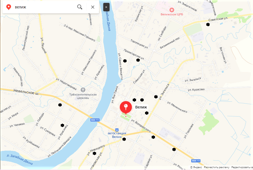 В центральной части Велижа: Большая Слободская ул. (сегодня в районе Кропоткина ул., д. 38-40), Слободской пер. (Кузнецова ул., д. 11), Слободская ул./Малая Слободская ул. (Менжинского ул., д. 20), Прировская ул. (Энгельса ул., д. 105/26), Воейкова пер./Витебский пер. (Воейков пер. был переименован ещё до 1917 года в Витебский пер.; в настоящее время нет этого переулка, он находился между улицами Новицкого и Спартаковская, выше и параллельно Парковой ул.), Училищная ул. (Розы Люксембург ул., в районе автостанции), два дома на Смоленской ул. (Володарского ул., д. 26 и д.50).