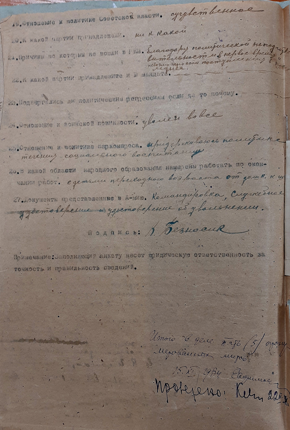 Прошёл десяток лет. В переписке с активистом «Форума: Еврейские корни» я вспомнил историю поиска сведений о К. Безносике. Вскоре мне сообщили, что в архиве Петербурга (Фонд института дошкольного воспитания) хранится «Дело студента Безносика К. Д.». Ознакомление с не особенно информативным делом позволило узнать, что в 1922 году школьный учитель из Витебска Кауфман Давидович Безносик, 1897 года рождения был направлен на учёбу в Академию социального воспитания и учился там до осени 1924 года. Прошёл ли он полный курс этого ВУЗа, осталось неизвестным.