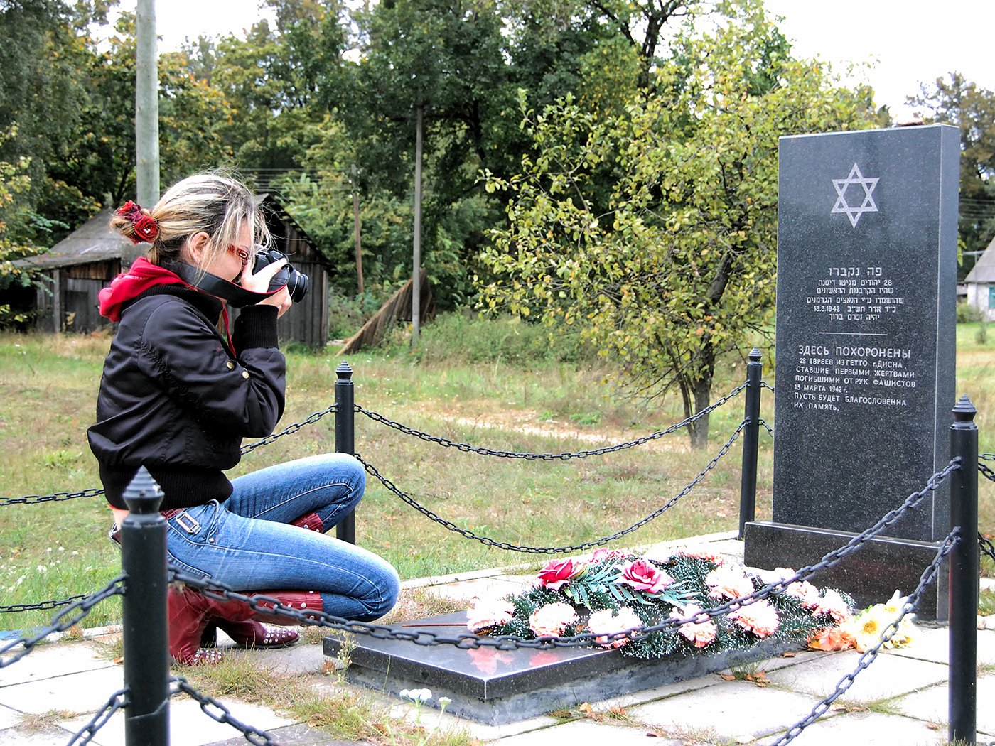 Мы подошли к скромному памятнику из гранита и, по еврейской традиции, положили около него маленькие камушки. На памятнике надпись: «Здесь похоронены 28 евреев из гетто Дисны, ставшие первыми жертвами, погибшими от рук фашистов 13 марта 1942 года. Пусть будет благословенна их память».