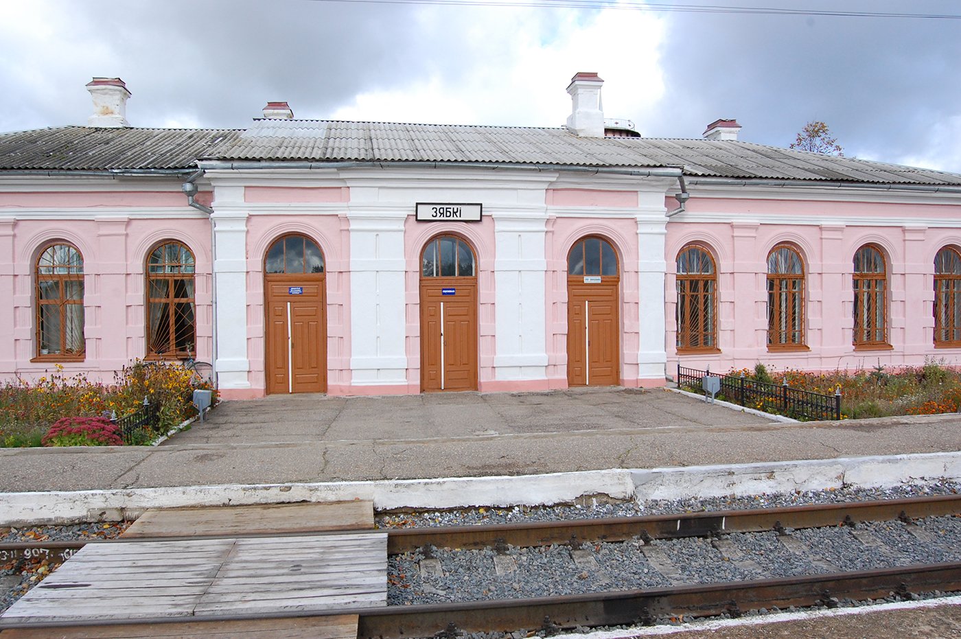 Приехав в Зябки, мы отправились на железнодорожный вокзал вовсе не для того, чтобы посмотреть расписание поездов. Станция теперь не такая уж бойкая. Проходит всего несколько пассажирских поездов, и останавливаются они, в лучшем случае, на пару минут. А вот само здание вокзала заинтересовало. Построено оно из кирпича, это, говоря сегодняшним языком, типовой проект того времени. По этому же проекту были возведены вокзалы в населенных пунктах Фариново, Загатье, Подсвилье, Крулевщизна, Парафьяново. В Зябках вокзал сохранился и теперь.