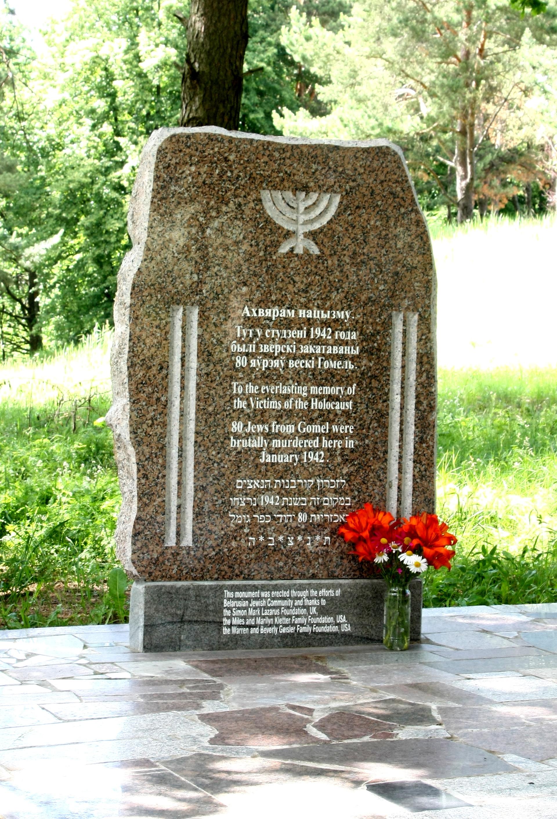 На памятнике написано, что 80 евреев местечка Гомель были расстреляны в январе 1942 года.