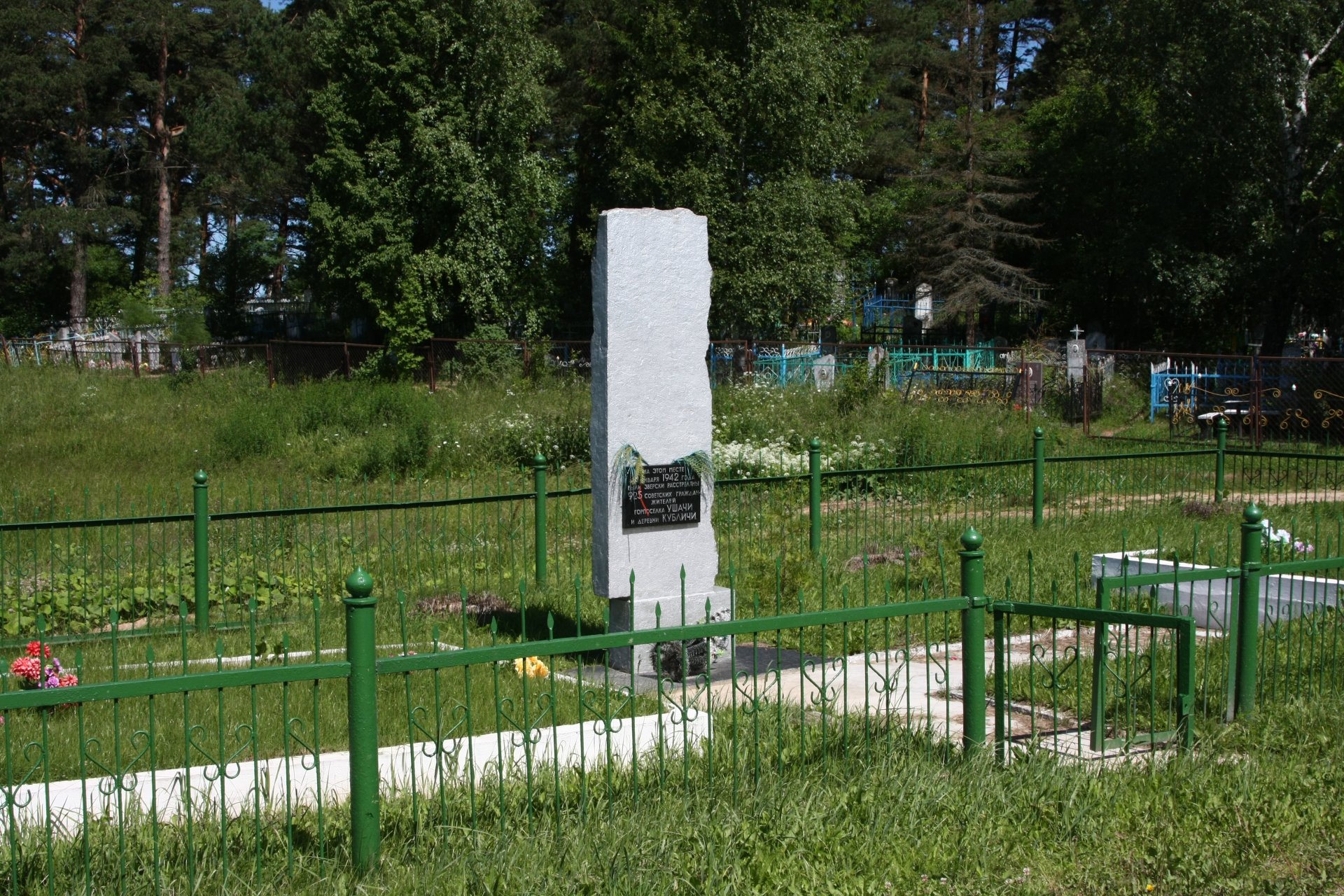 «Товарищ! Склони голову перед памятью погибших. 6.1.1942 г. фашистскими палачами расстреляны 925 жителей городского поселка Ушачи и деревни Кубличи».