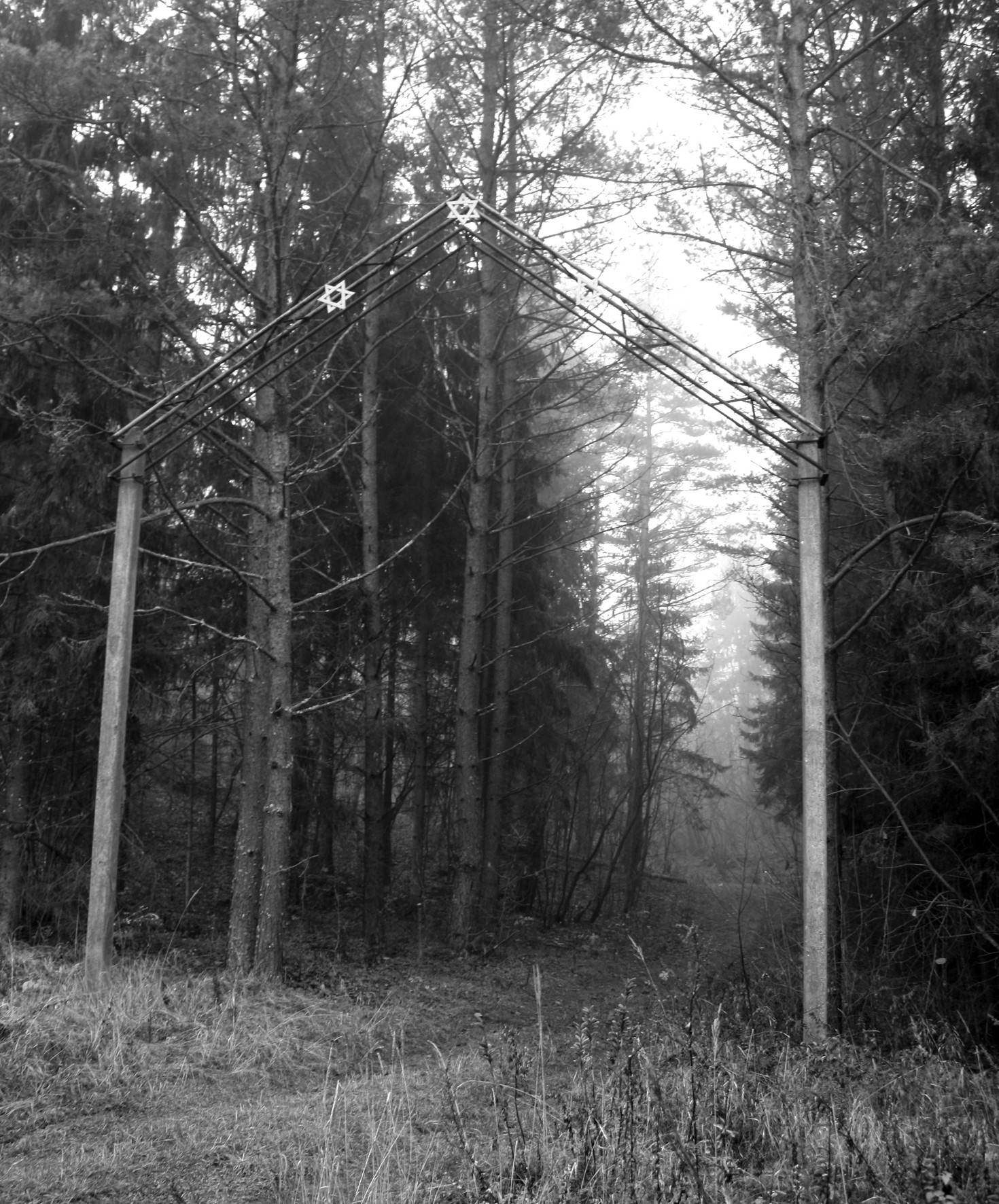 У лесной дороги стоят два бетонных столба и наверху, метрах в пяти от земли, металлическая арка, на ней прикреплены голубые шестиконечные звезды.