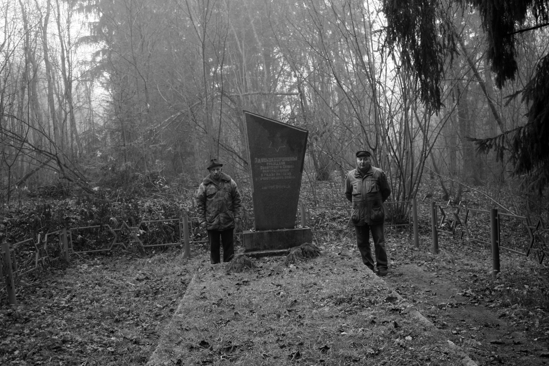 Отправились по полевой дороге дальше и ощутили все «прелести» белорусской осени. На глиняной дороге стояли лужи. Мы выходили из машины и к лошадиным силам двигателя «Рено» добавлялись три человеческие силы, толкавшие машину. Наконец, добрались до леса. От окраины Городка километра четыре-пять. Безусловно, немцы, плохо ориентировавшиеся вне населенных пунктов, не могли сами выбрать место казни. В этом им содействовали местные приспешники.