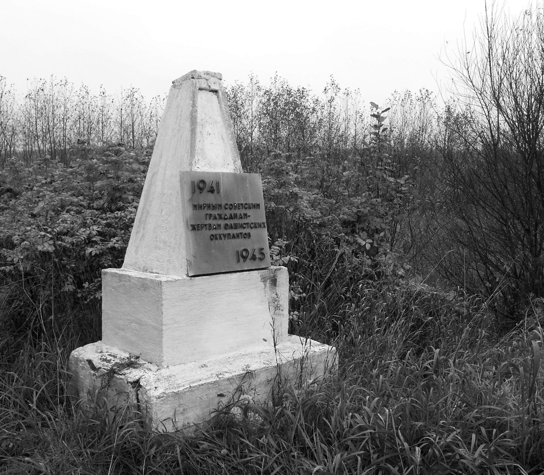 Под высокой сосной памятник из черного гранита. На нем выбиты слова о гражданах Советского Союза, расстрелянных в августе 1941 года. Памятник поставили в начале 80-х годов. Активное участие принял в этом деле Аркадий Борисович Будман. Он был в свое время председателем колхоза – известный в районе человек. Родился в Молдавии. В годы войны подразделение, которым он командовал, взяло Городок и как тогда полагалось, Будман был назначен комендантом Городка. Здесь познакомился с девушкой, женился и остался жить до глубокой старости. Дети уехали в Германию, сам он не очень хотел следовать за ними, но жизнь заставила.
