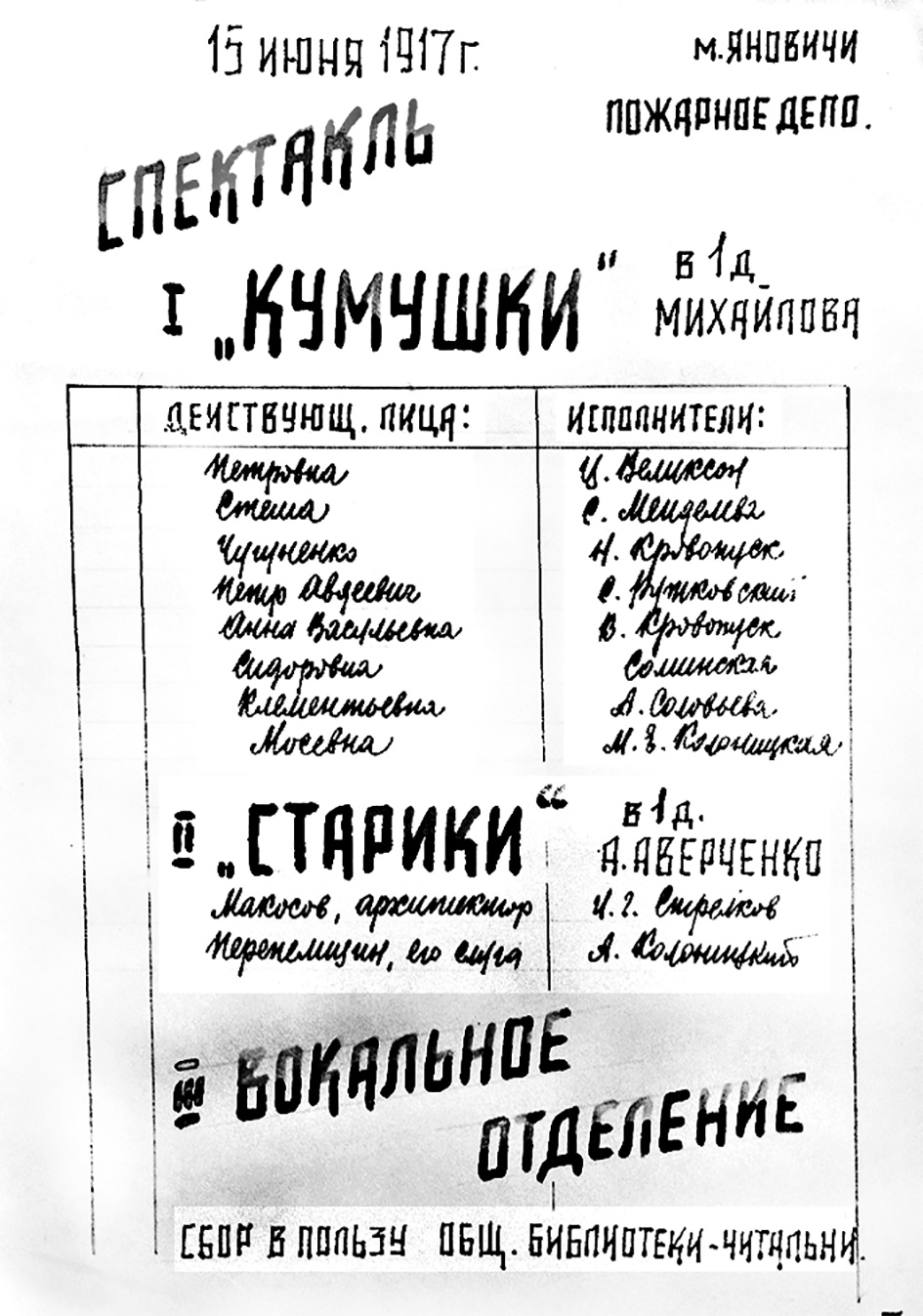 Сегодня даже трудно представить, но в голодные годы Гражданской войны люди думали не только о хлебе, в местечке Яновичи серьёзно занимались театром. В школьном музее сохранились театральные афиши и фотографии актёров, сцен из спектаклей.