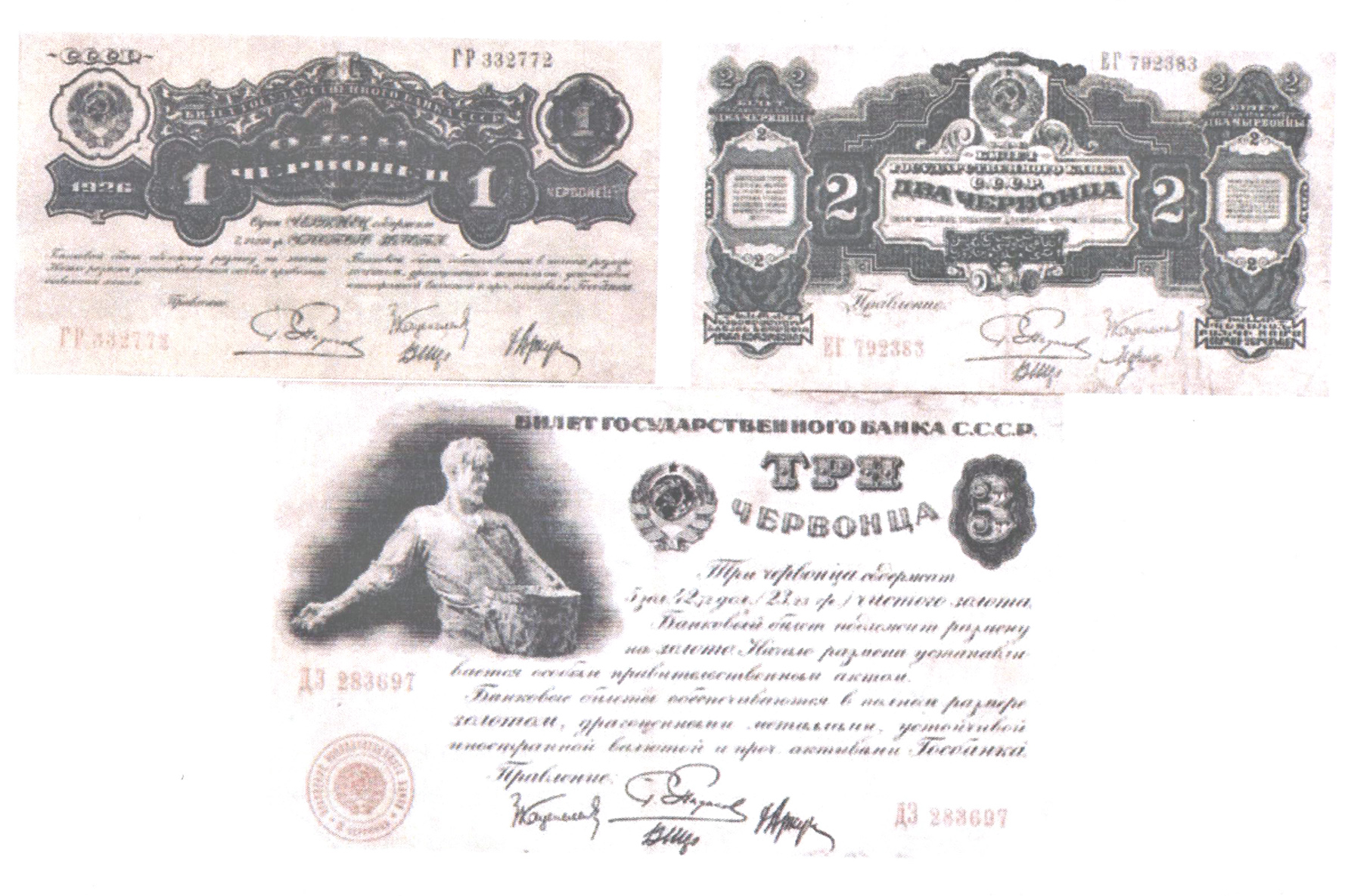 11 октября 1922 года Государственному банку было предоставлено право выпуска банковских билетов-червонцев. 27 ноября 1922 года в обращении были выпущены банковские билеты номиналом в 1, 3, 5, 10 и 25 червонцев. Один червонец приравнивался к одному золотнику 78,24 доли чистого золота, то есть к 7,74234 грамма чистого золота.
