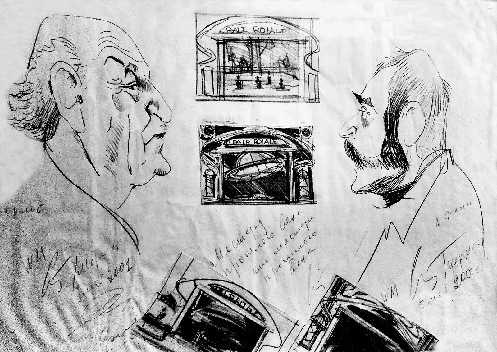 О шарже: Аркадий Эскин, Вениамин Маршак и Владимир Орлов что-то обсуждали в филармонии. Веня схватил карандаш и набросал этот шарж с посвящением: «В. Орлов, А. Эскин. 3 мая 2001 г. Мастеру прошлого века от мастера прошлого века. В. М.»