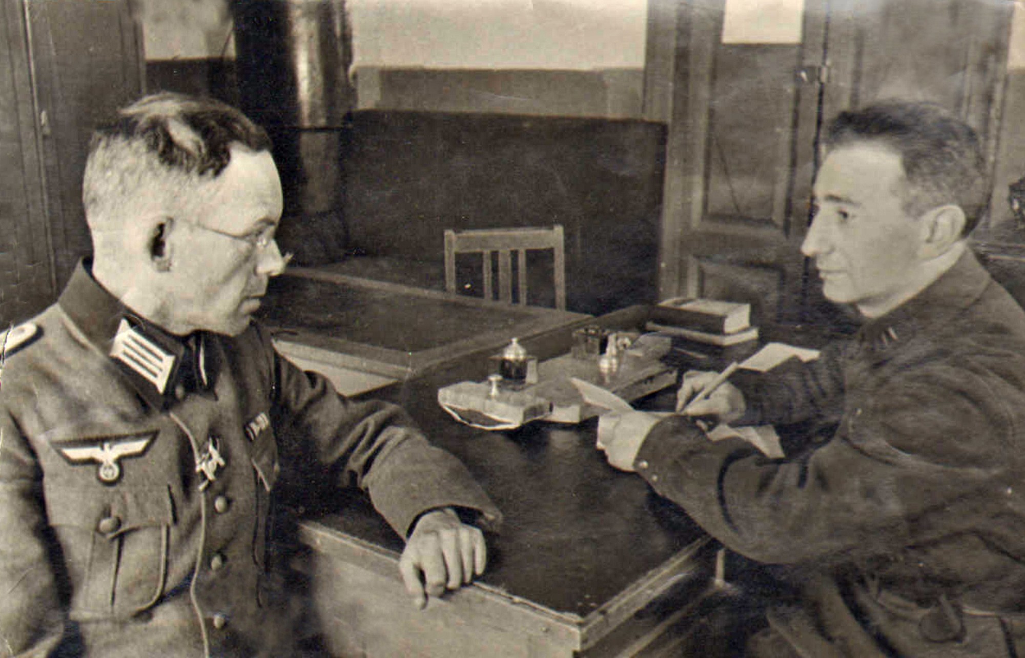 На одной из фотографий запечатлен момент, когда Семён Рувимович ведёт допрос немецкого офицера. «По рассказу отца, – пишет Владимир Райберг, – шёл отбор немецких офицеров для будущего правительства ГДР».