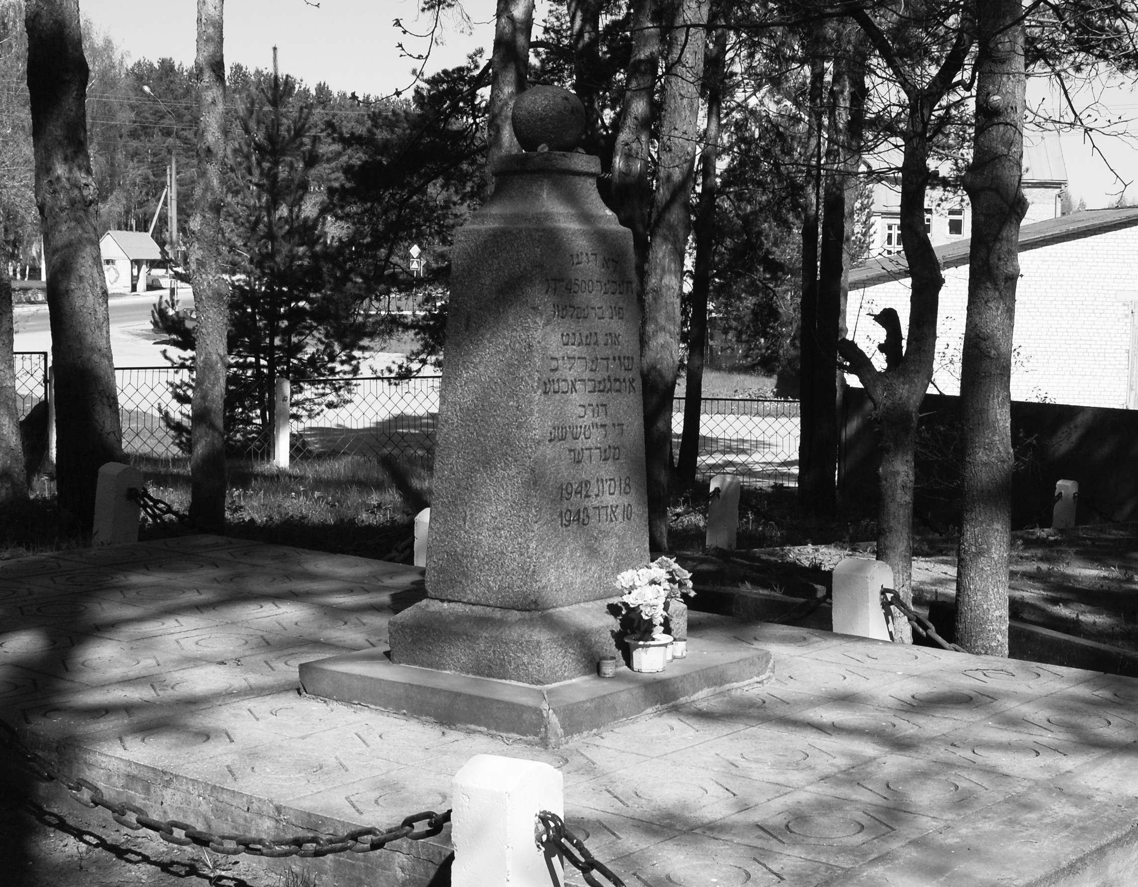 ...Закоченевшие трупы местные жители перевезли в Барок и захоронили. Первый памятник расстрелянным евреям поставил за свои деньги Рудерман. Памятник стоял с послевоенного времени до середины 2000-х годов. Потом на средства Фонда Лазарусов поставили новый памятник.
