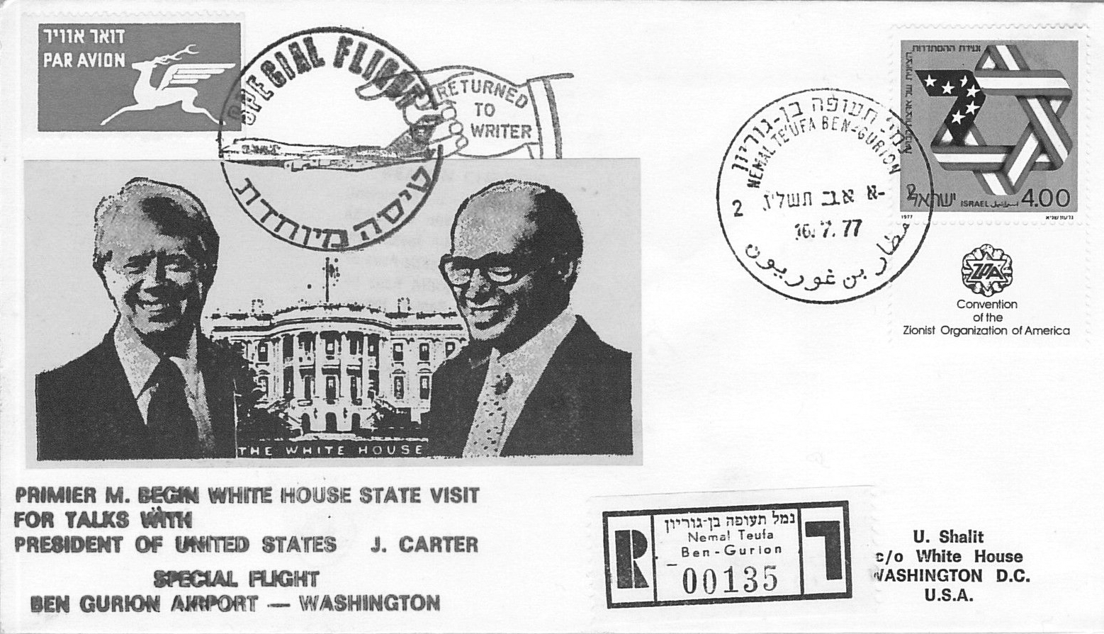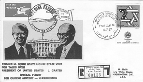 19 ноября 1977 года в Израиле приземлился самолет, на борту которого находился президент Египта Анвар Садат. К этому событию израильская почта подготовила специальный штемпель, было выпущено несколько конвертов. На части из них помещён и портрет премьер-министра Бегина. 25 декабря 1977 года Бегин во главе большой делегации вылетел на переговоры в Исмаилию.