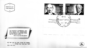 5 сентября 1978 года в Кемп-Дэвиде начались переговоры, на которых был выработан мирный договор между Израилем и Египтом. Официальная церемония подписания договора о мире между Израилем и Египтом состоялась 26 марта 1979 года. В честь этого события в Израиле были выпущены марка и блок, которые гасились