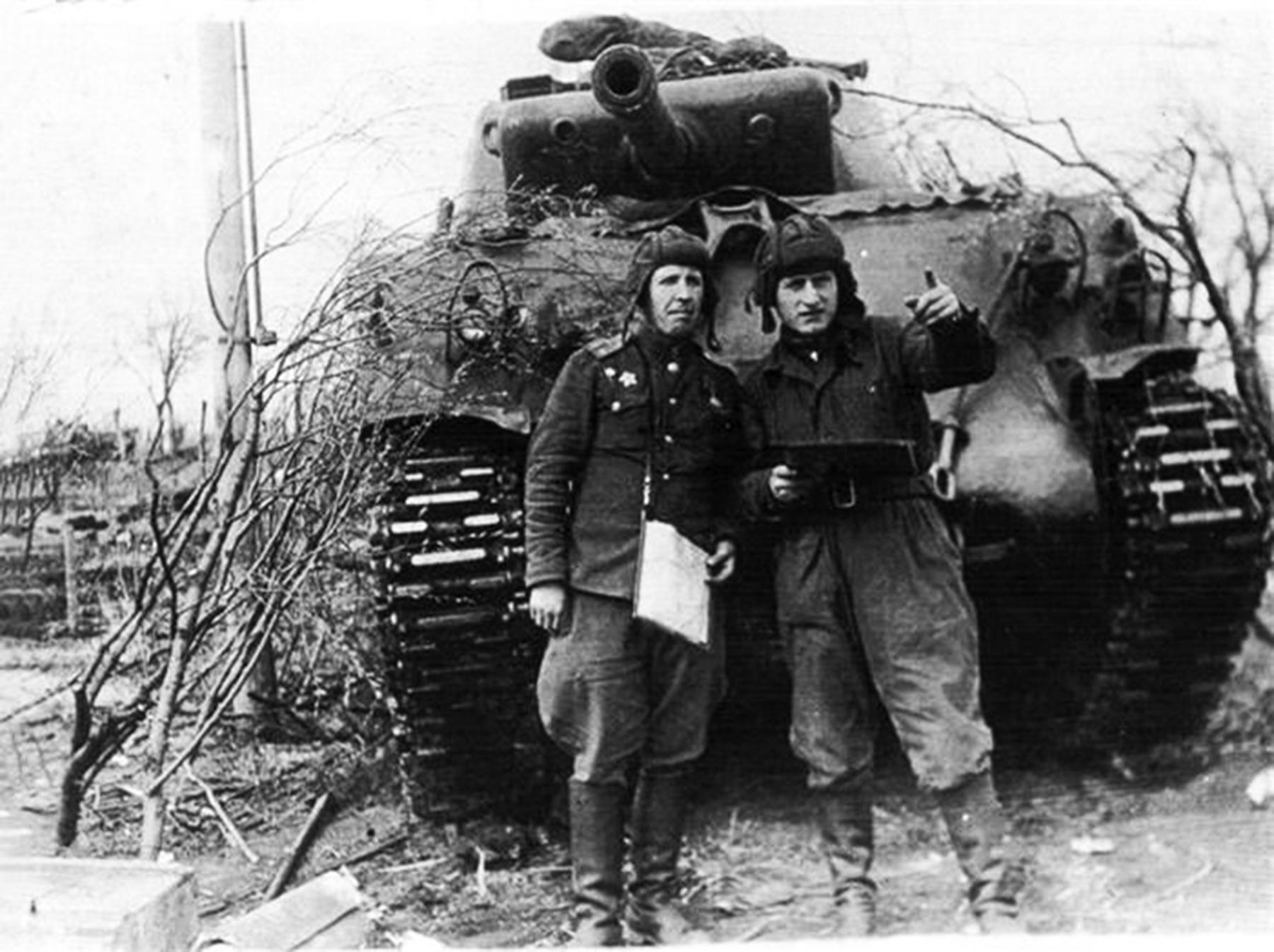 В оформлении сувенирного листка использована также фотография, на которой изображён подполковник-танкист Аркадий Кацевман (справа). Аркадий Кацевман родился в декабре 1919 года в местечке Дубоссары в Молдавии. После окончания семилетки поступил в Одесский мукомольный техникум, но не закончил его, был призван в армию. Окончив Наро-Фоминское танковое училище, он был направлен в 55-ю легкотанковую бригаду, которая летом 1940 года была преобразована в 14-ю танковую дивизию. В составе этой дивизии Аркадий и встретил войну. Основные этапы военного пути Аркадия Кацевмана и его последующую жизнь в СССР и Израиле подробно описывает Александр Непомнящий в статье «Подполковник двух армий». Первое ранение Кацевман получил на третий день войны, но после лечения в полевом госпитале быстро вернулся в строй. Затем воевал под Смоленском, выходил из окружения под Ярцевом через Соловьёвскую переправу на Днепре, принимал участие в попытках прорыва ленинградской блокады, в бою возле посёлка Синявино получил сразу два тяжёлых ранения, вернулся в строй и вновь был ранен. Опять вернулся, на этот раз в 18-й танковый полк.
