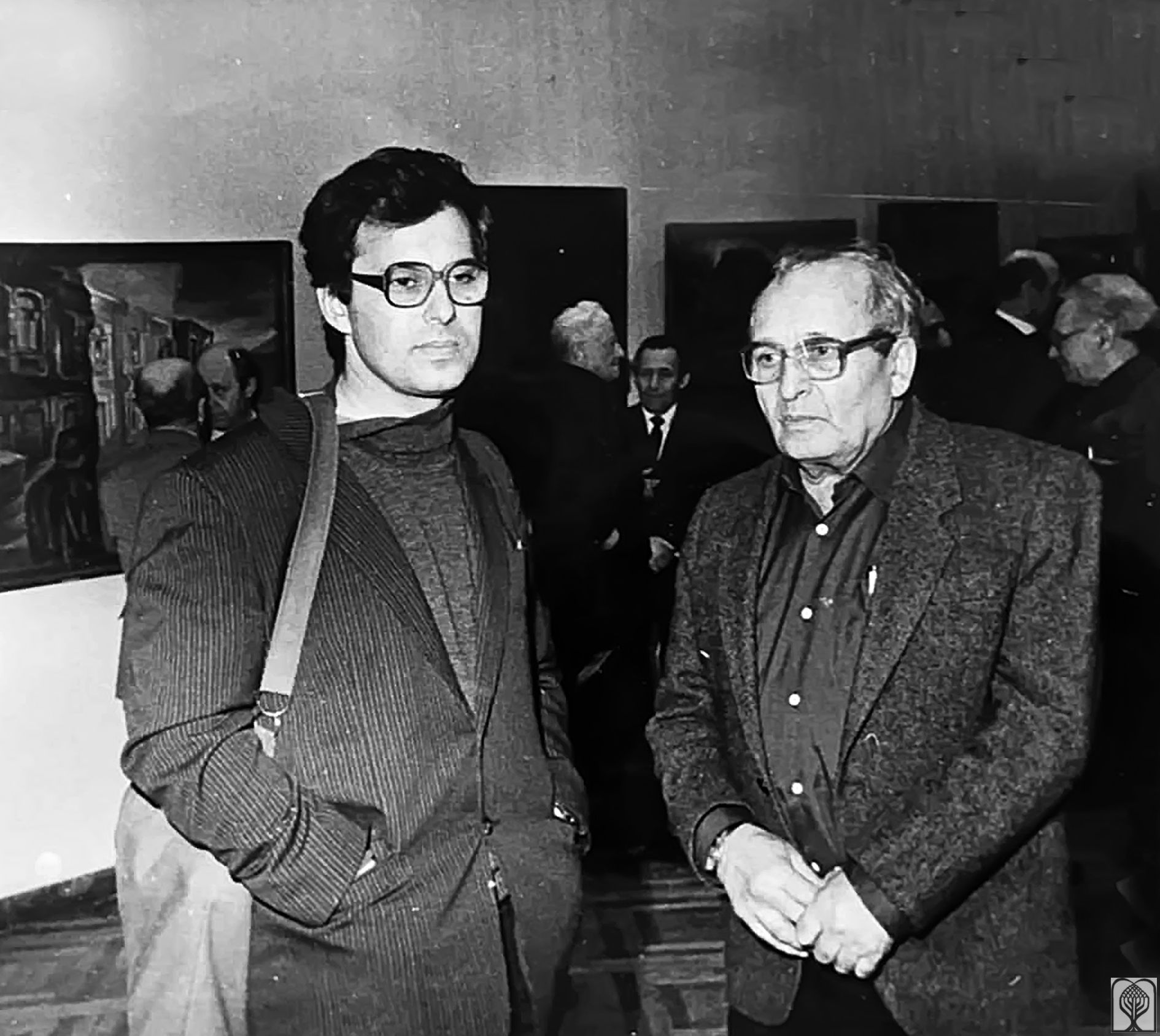 На верхней площадке, справа от обшарпанной, обитой жестью двери было несколько звонков с именами обитателей этих мастерских. Я позвонил. Дверь не открывалась. Позвонил ещё раз. Решил уже уходить, но дверь заскрипела, отворилась на треть, и оттуда протиснулся невысокий пожилой, весь вымазанный краской, с огромными печальными глазами художник. Я представился, сказал, что на меня, студента кафедры живописи, увиденное на выставке полотно произвело сильнейшее впечатление. Мы простояли минут сорок на лестничной площадке, я рассказал о себе, о своей учёбе и учителях. Оказалось, что и он учился у Ивана Осиповича в художественном училище, да и родились мы оба на Могилёвщине, я – в Бобруйске,