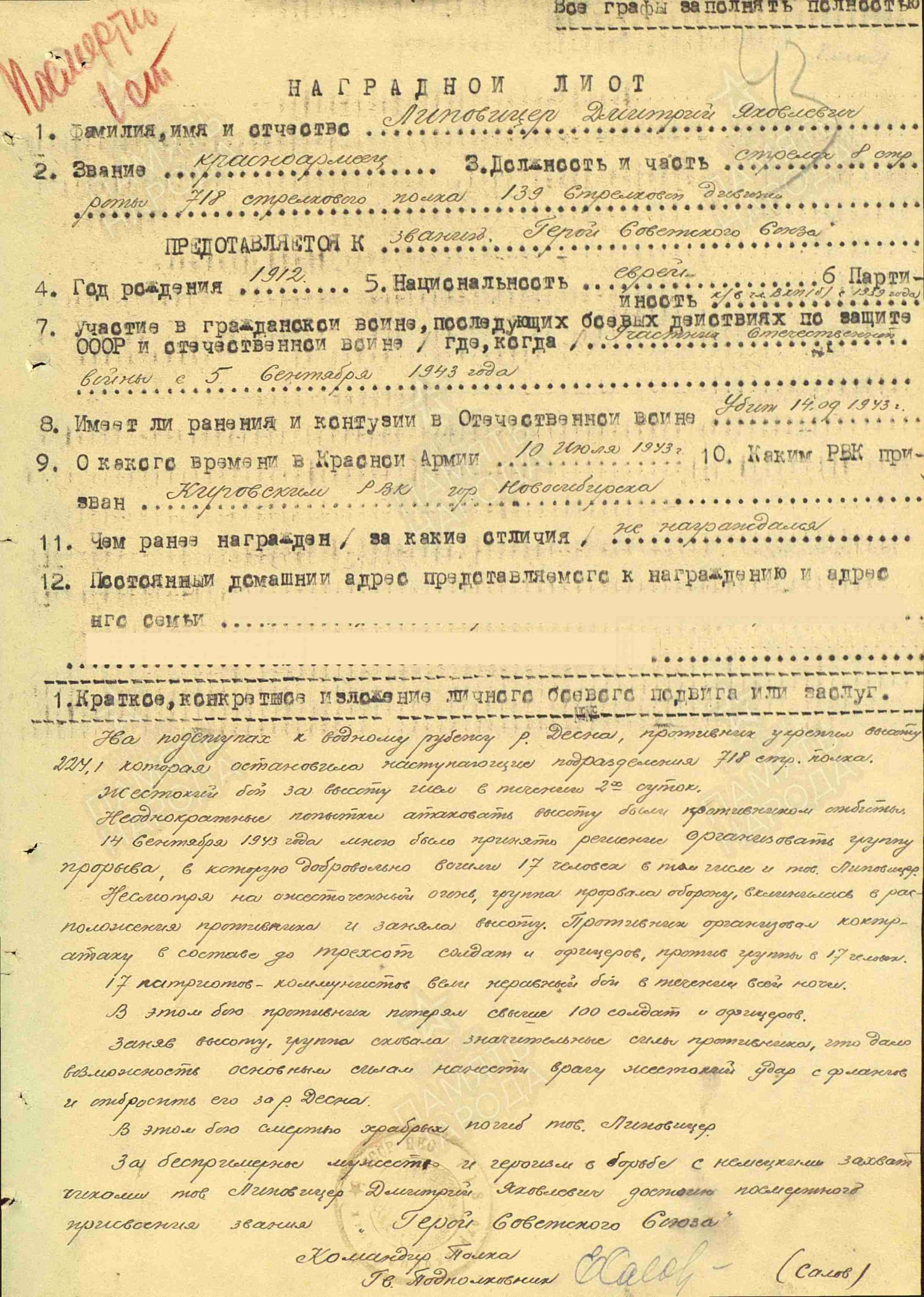 Что произошло на «безымянной высоте» в середине сентября 1943 г. лучше всего ознакомиться (орфография по документу) по наградным листам: