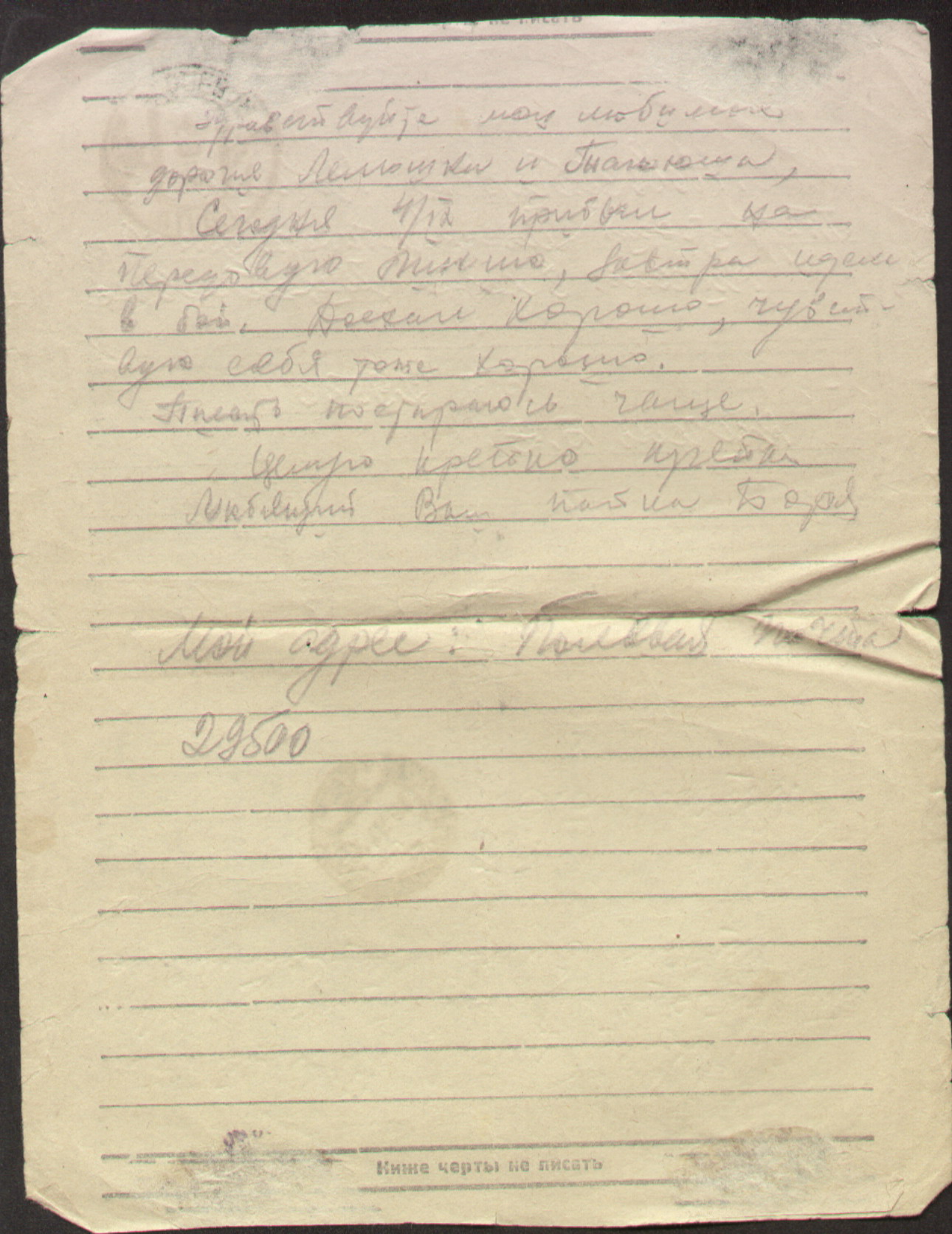 04.09.1943. Здравствуйте мои дорогие и любимые. Лелюшка и Танюша. Сегодня 04.09.1943 г. прибыли на передовую линию, завтра идём в бой. Доехали хорошо, чувствую тоже хорошо. Писать постараюсь часто. Любящий ваш, папка Боря.