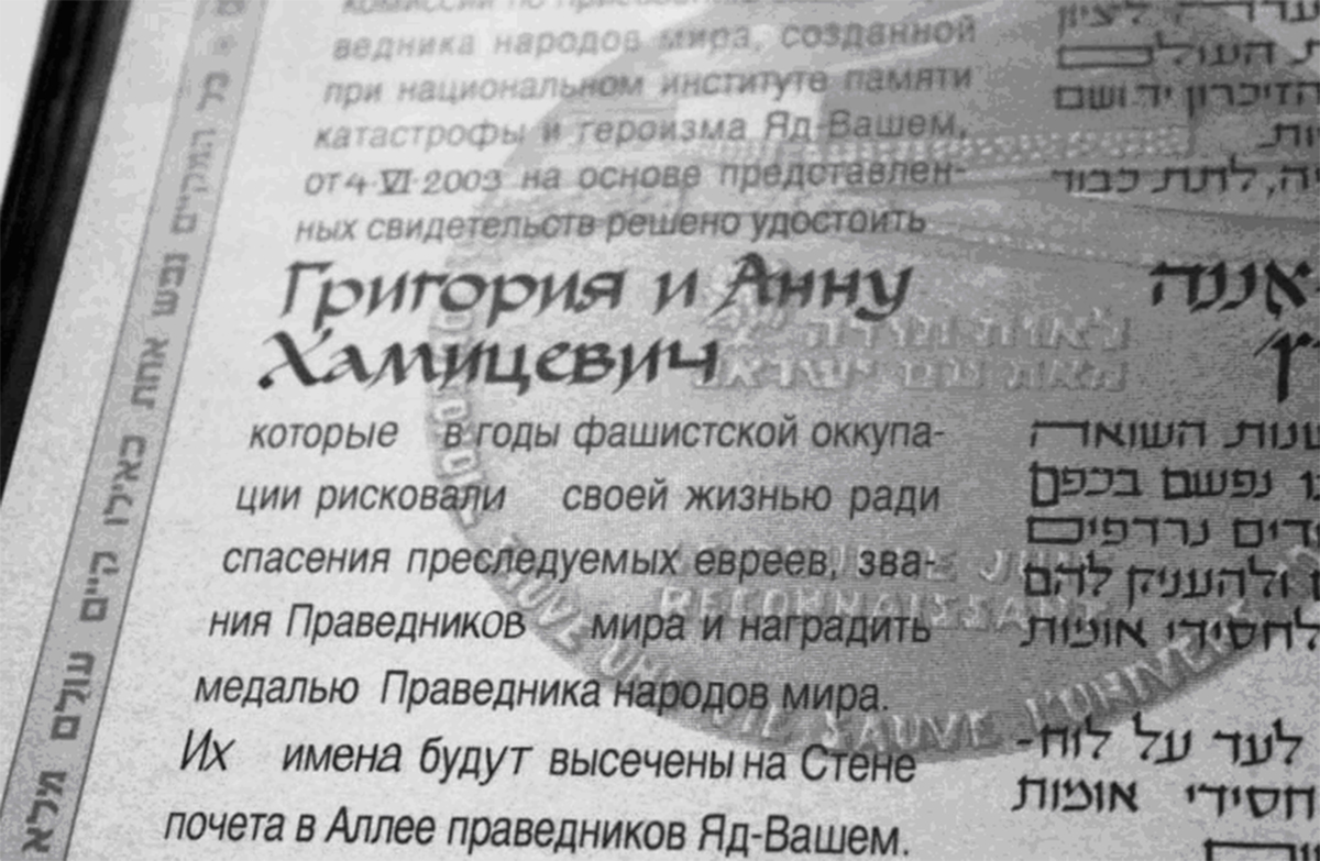 Тогда, в 2003-м, дети Брониславы обратились в посольство Израиля. Вскоре Хамицевичей вызвали на приём в посольство. Туда же приехала семья Брониславы и другие евреи из Солигорского и Любаньского районов, которым удалось спастись во время войны. Анне Григорьевне вручили две почётные грамоты и две медали. Статус Праведника Народов Мира получил и муж Анны Владимир Петрович, которого по ошибке записали как Петра.