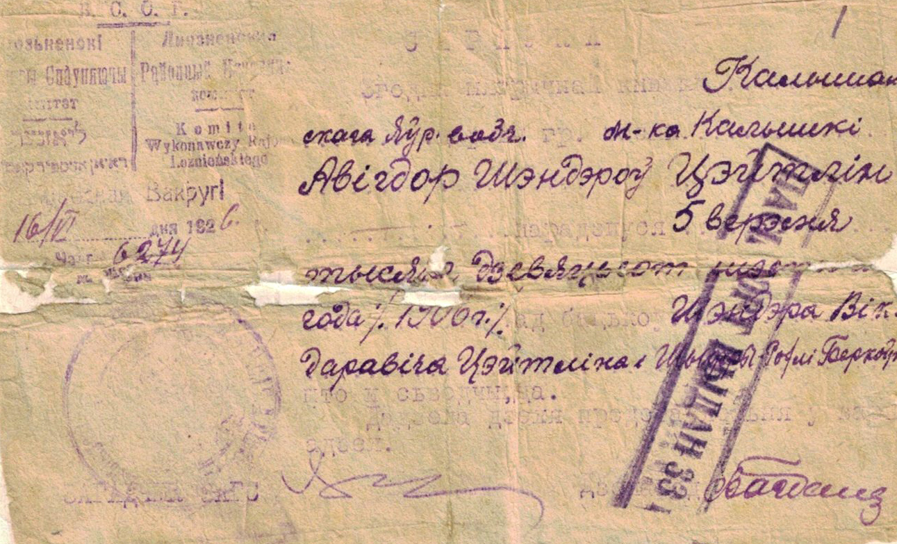 Здесь мы и познакомились. Я увидел документы его деда. Свидетельство о рождении Авигдора Шендерова Цейтлина, удостоверяющее, что родился он в Колышках 5 сентября 1906 года и его родителями были Шендер Вигдорович Цейтлин и Шифра-Рохля Беркович. Интересно, что на свидетельстве в верхнем левом углу штамп с надписью на четырёх, тогда государственных (1926 г.) языках Белоруссии: белорусском, русском, еврейском (идиш) и польском.
