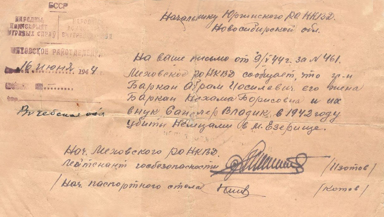 Их имена: Абрам Иосилевич Баркан, Нехама Борисовна Баркан, Владик Сандлер (ему в 1941 было 6 лет).