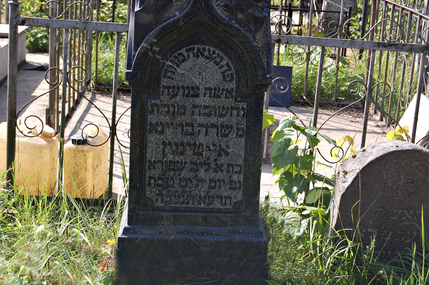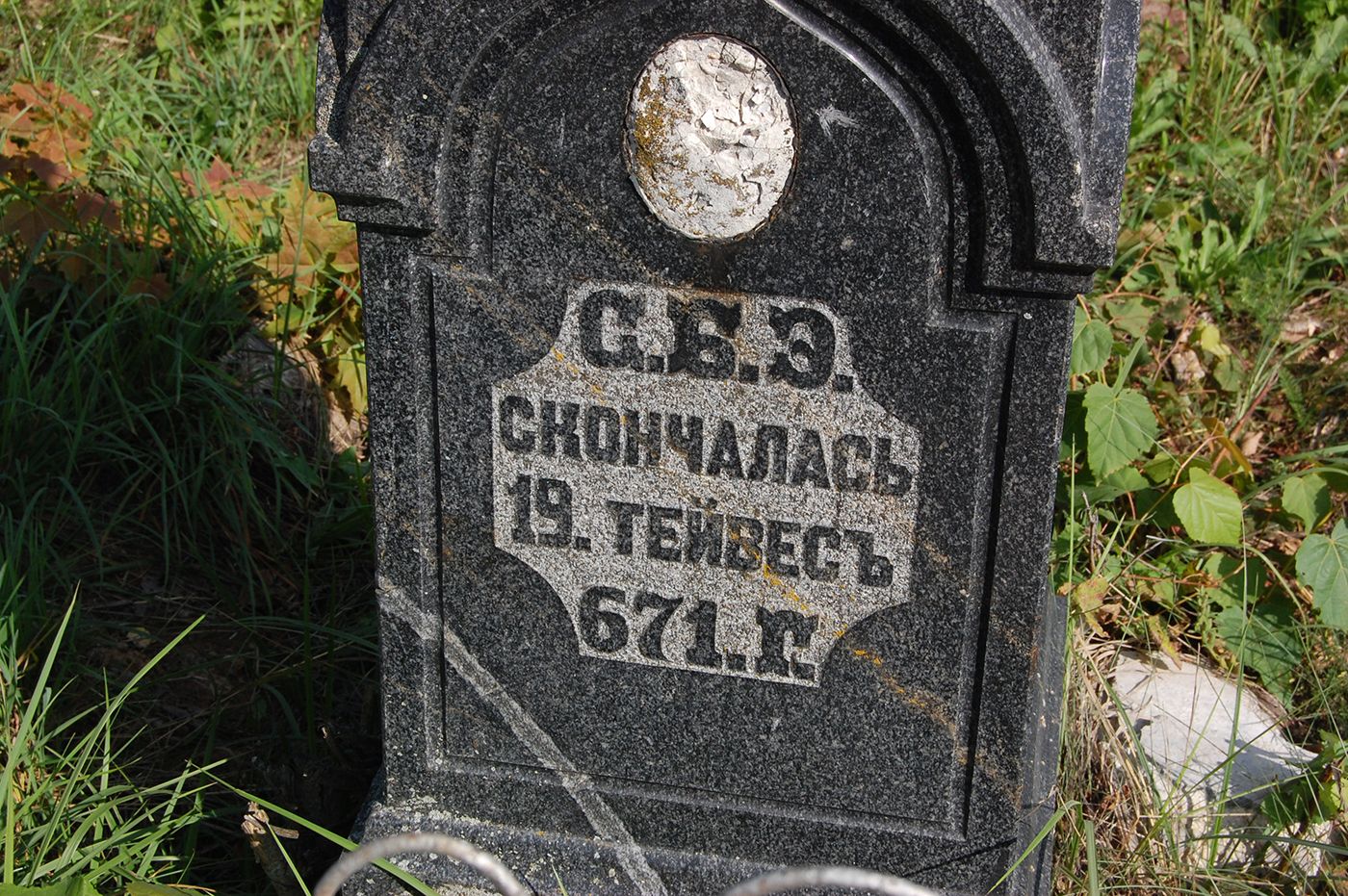 Каждое старое захоронение – тайна, особенно если на памятнике только надпись на древнееврейском, и прочесть её ты не в состоянии. А если и есть на обратной стороне надпись на русском языке, то тоже становится понятным далеко не всё и исследователей ждёт большая работа. Особенно, если надпись на русском языке вот такая – «С.Б.Э. Скончалась 19 тейвесъ 671 г.». (фото 3) Как будто кто-то хотел скрыть имя и фамилию усопшего от посторонних глаз, но в то же время привлечь внимание к памятнику.