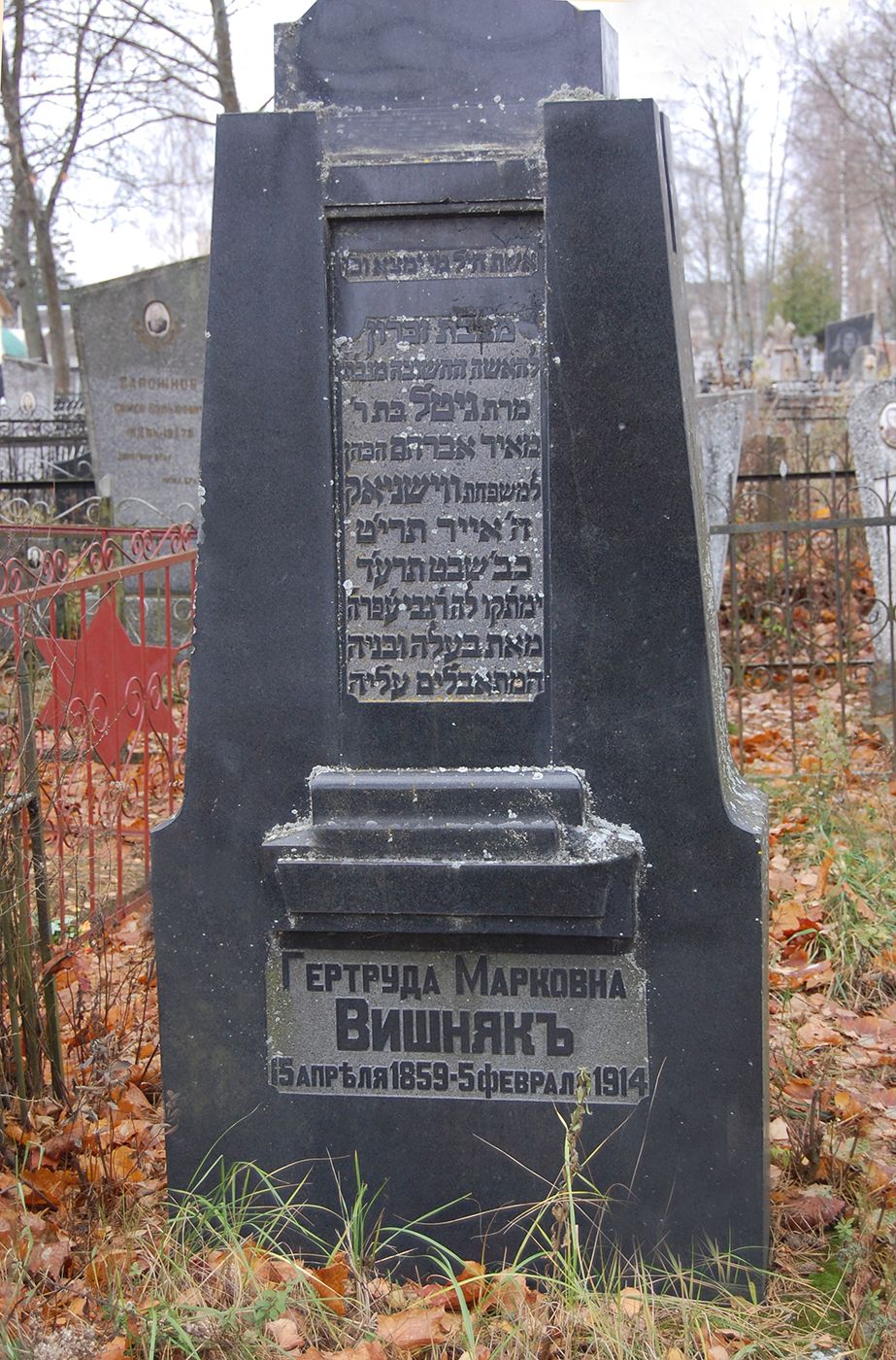 На Старо-Улановичском кладбище сохранился памятник из чёрного гранита с надписью на русском и древнееврейском языках (фото 5). Памятник дорогостоящий, и судя по всему, поставлен на могиле жены Израиля Вульфовича – Гертруды Марковны Вишняк, родившейся 15 апреля 1859 года и умершей 5 февраля 1914 года.