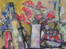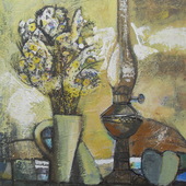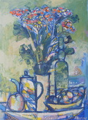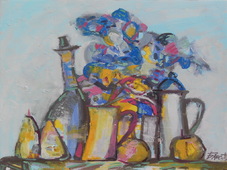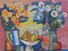 И в своём творчестве он ведёт всё ту же, хорошо узнаваемую, линию. В живописи он может и любит на одном холсте соединить классический натюрморт, с местечковыми домиками, церквями и осенними деревьями. Они не только не спорят друг с другом, а наоборот, чувствуют себя единым целым.