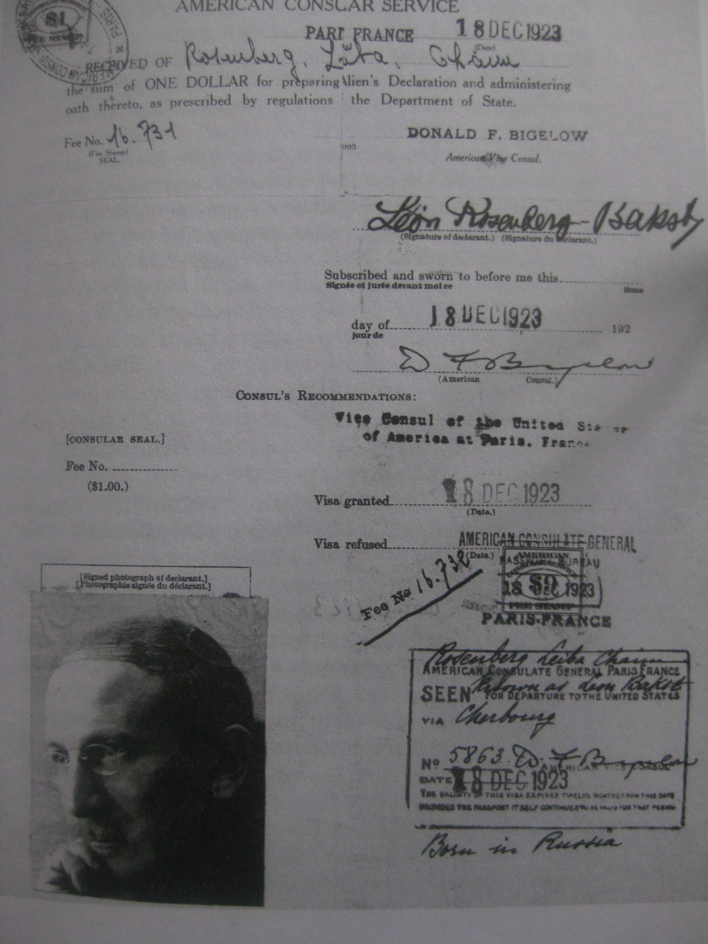 Специальным Уголовным положением, принятым в 1903 г., были подтверждены законы, которые предусматривали наказание за самовольную смену имени и фамилии, под которыми евреи записаны в свидетельстве о рождении. Запрещалось менять фамилию даже при переходе в другое вероисповедание. Допускалась лишь двойная фамилия, которую супруги могли получить лишь с высочайшего соизволения и при особых на то причинах. Судя по всему, прошение так и не было отправлено, так как Любовь Павловна во втором замужестве носила фамилию Розенберг , а не Гриценко-Бакст [6, л.1-3 об.], а в официальном документе – дипломе – документе на звание академика, которого он удостоился в 21 октября 1914 г. его имя указано и в официальной версии, и как творческий псевдоним: «Лейба-Хайм Розенберг (он же Лев Бакст)». В визе, выданной американской консульской службой в 1923 г. художник фигурировал сразу под тремя именами: под двойной фамилией Леон Розенберг-Бакст, под паспортным именем Розенберг Лейба–Хаим (с припиской – «именуемый Леон Бакст»). [17, с. 68]