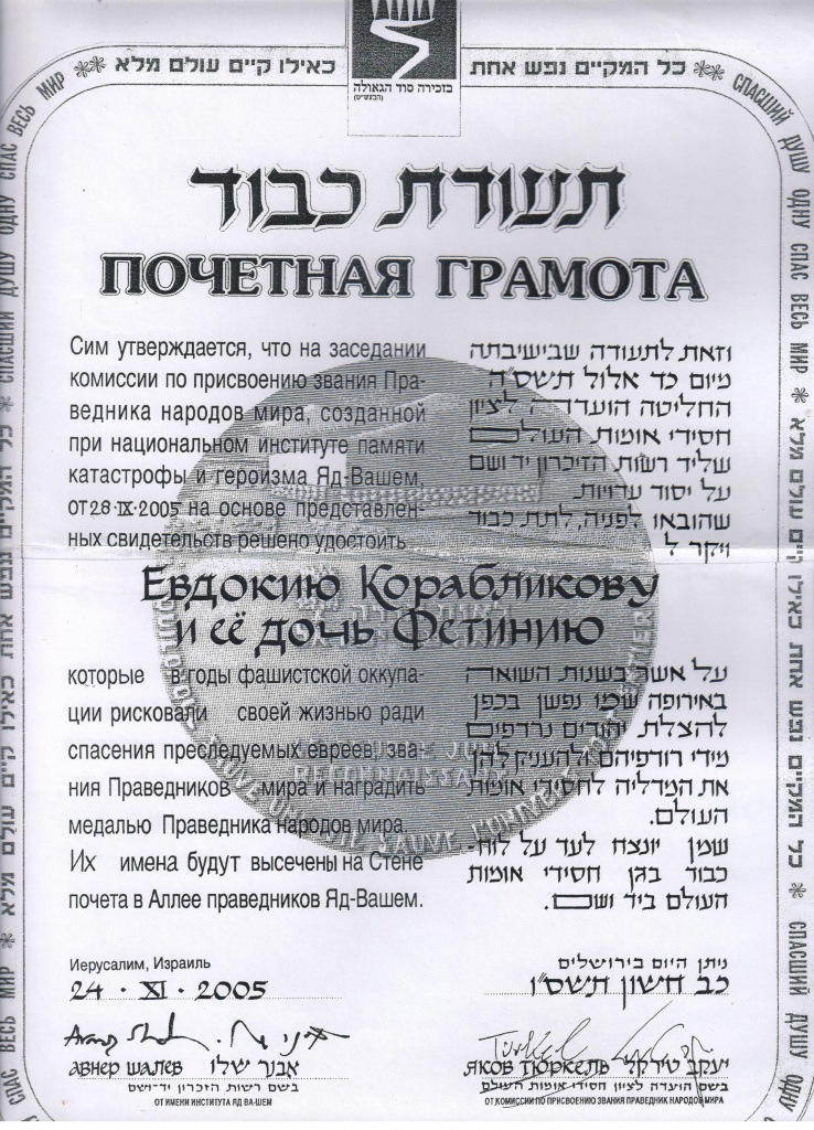 Они признаны Праведниками народов мира в «Яд ва-Шем». Я и мой брат Сергей безмерно им благодарны, что спасли нас. В этом же мемориале, в списке жертв Вильнюсского гетто, есть имена моего дедушки Иосифа и бабушки Тамары Троцких, моей матери Блюмы Карабликовой (Троцкой).