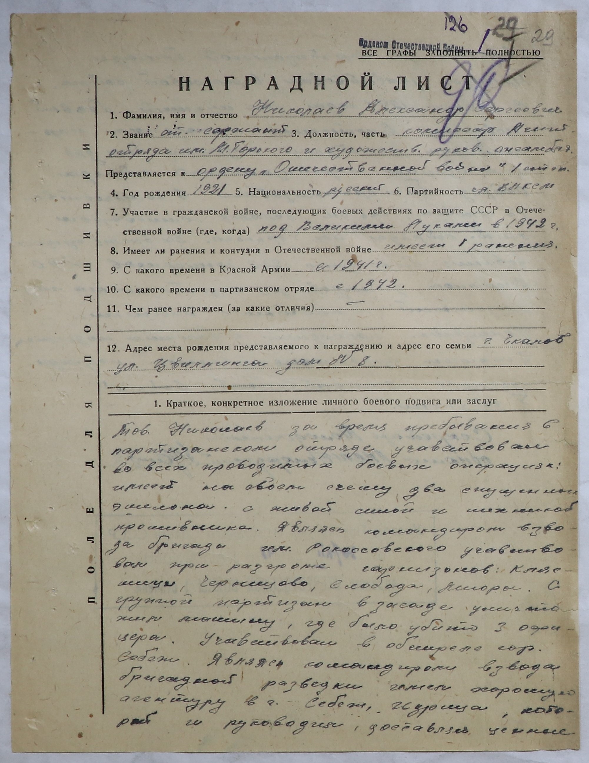 Следующий заход в базу «Партизаны Беларуси» дал новые данные. Оказалось, что есть две записи о Николаеве Александре Сергеевиче, одна с годом рождения, другая – без. Во второй записи, которую я раньше не видела, есть наградной лист к представлению Николаева к ордену Отечественной войны 1 степени. В нём повторяются данные об адресе его семьи в Оренбурге (Чкалове) и есть крайне интересное описание его подвигов во время нахождения в партизанском отряде в бригаде Рокоссовского. Оказывается, он был командиром взвода бригадной разведки, имел агентуру в оккупированных городах Себеже и Идрице, руководил ею и получал полезные донесения для боевых действий бригады.