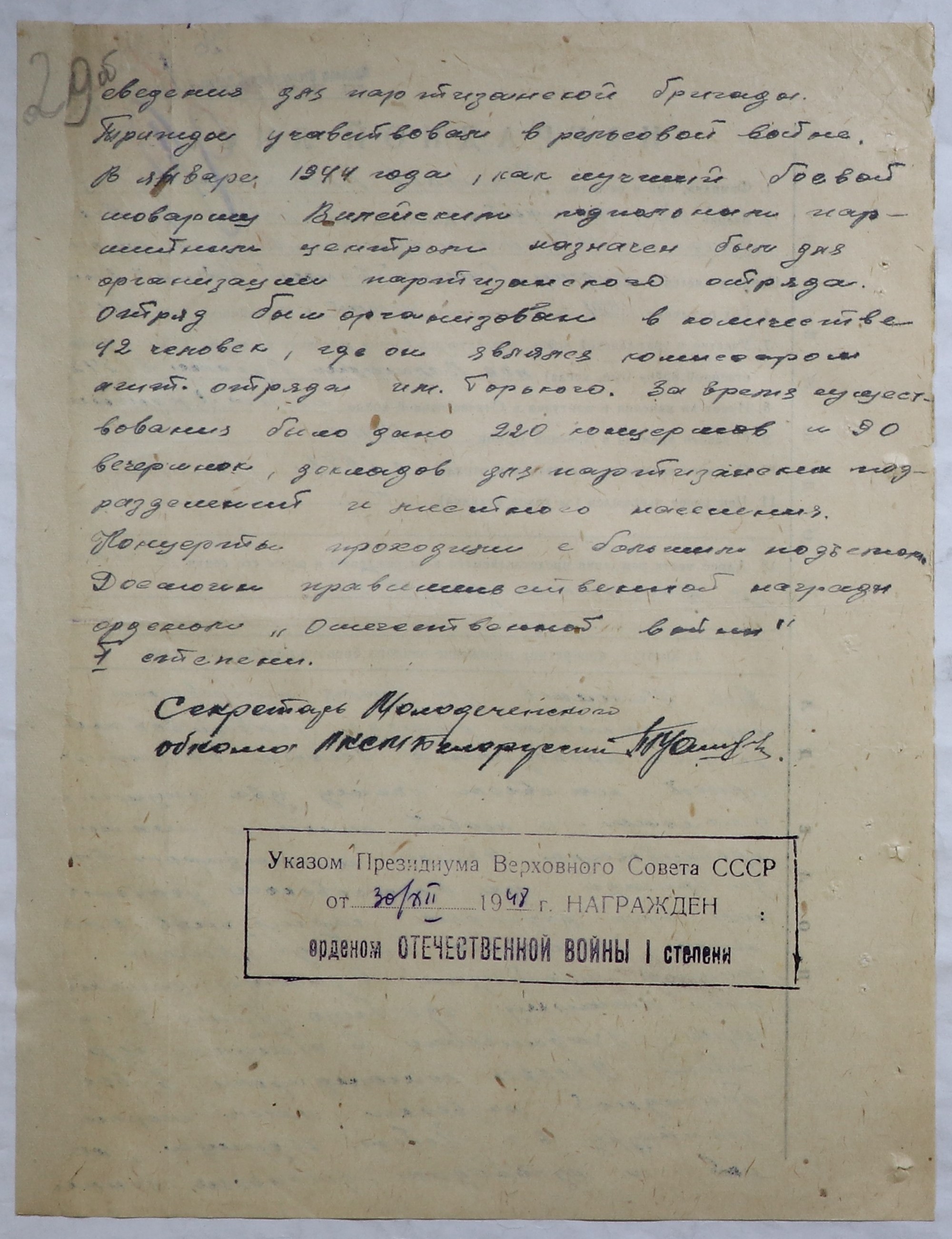 Штамп: Указом Президиума Верховного Совета СССР от 30/ХII 1948 г. НАГРАЖДЕН орденом ОТЕЧЕСТВЕННОЙ ВОЙНЫ I степени.