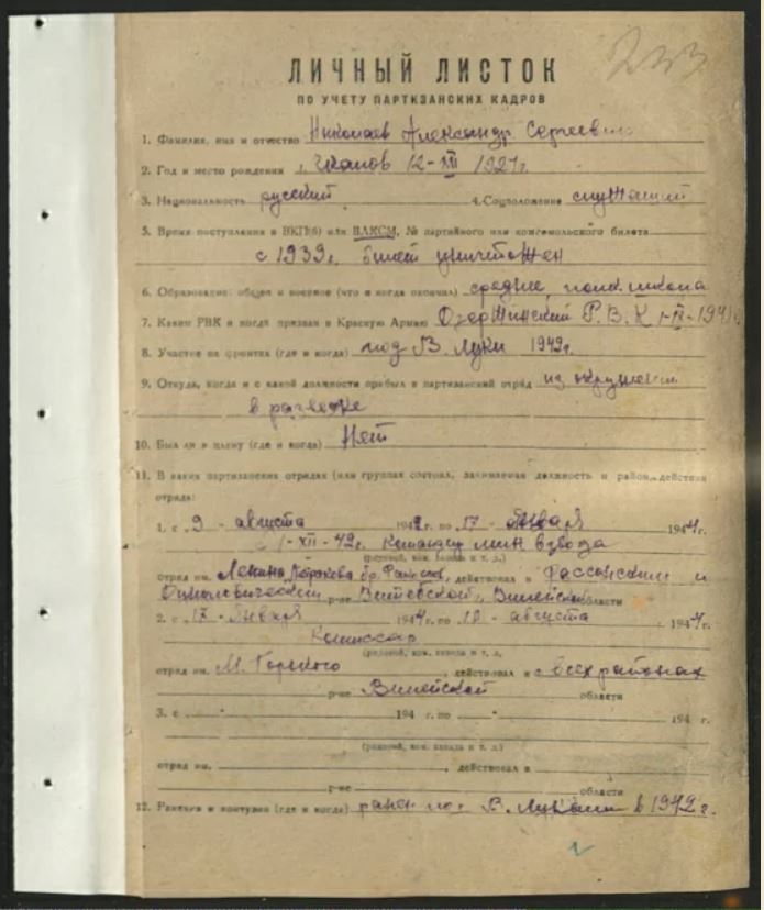 Я снова обратилась к базе «Партизаны Беларуси» и обнаружила новый документ, видимо, недавно выложенный, это «Личный листок по учёту партизанских кадров», заполненный его рукой, всё тем же почерком из писем Шели. И там есть детали, которых раньше не было в сведениях о Николаеве!