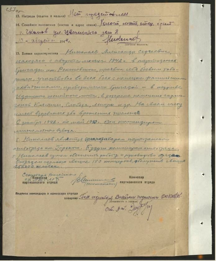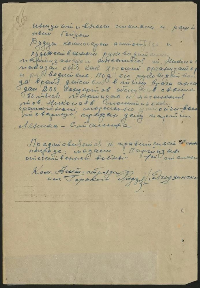 Тов. Николаев за время пребывания в партизанском отряде участвовал во всех проводимых боевых операциях: имеет на своём счету два спущенных эшелона с живой силой и техникой противника. Являясь командиром взвода бригады им. Рокоссовского, участвовал при разгроме гарнизонов: Клястицы, Черницово, Слобода, Леноры (?). С группой партизан в засаде уничтожил машину, где было убито три офицера. Участвовал в обстреле города Себеж. Являясь командиром взвода бригадной разведки, имел хорошую агентуру в г. Себеж, Идрица, которой и руководил, доставляя ценные сведения для партизанской бригады. Трижды участвовал в рельсовой войне. В январе 1944 года, как лучший боевой товарищ, Вилейским подпольным партийным центром назначен был для организации партизанского отряда. Отряд был организован в количестве 42 человек, где он являлся комиссаром агит. отряда им. Горького. За время существования было дано 220 концертов и 90 вечерних докладов для партизанских подразделений и местного населения. Концерты проходили с большим подъемом. Достоин правительственной награды орденом «Отечественной войны» I степени
